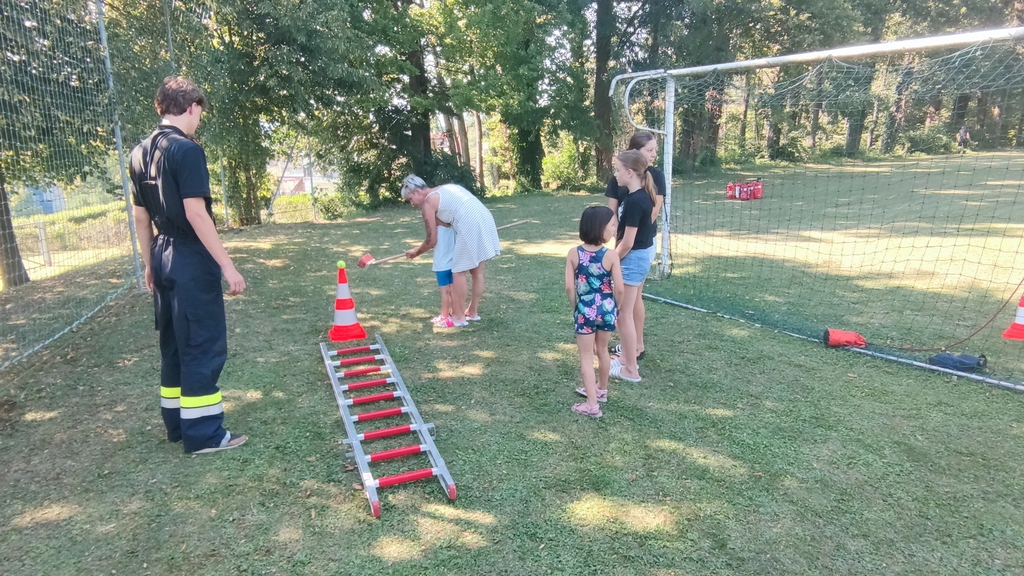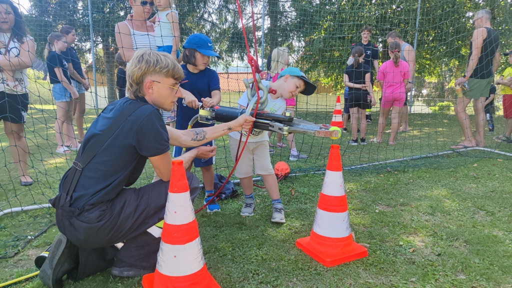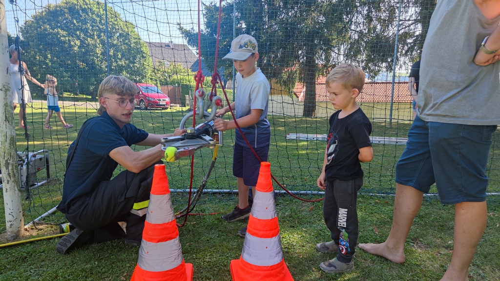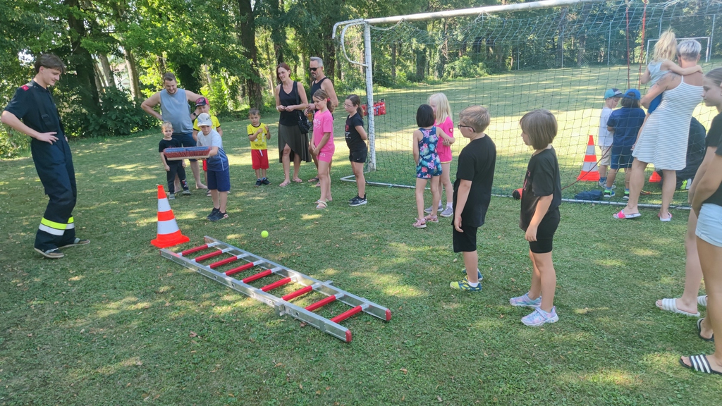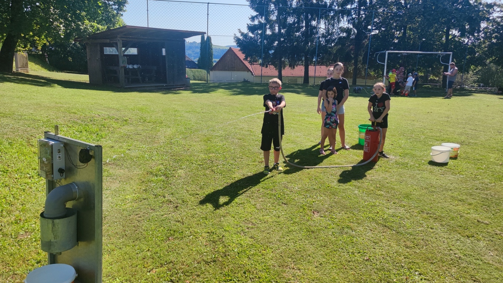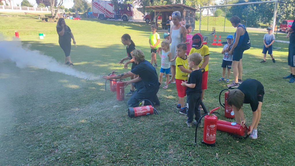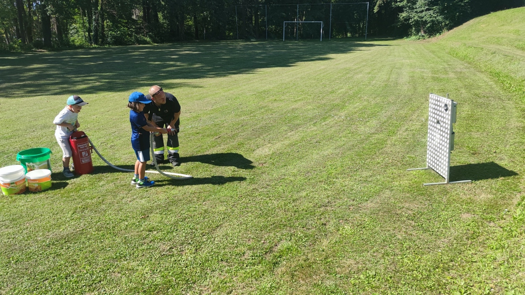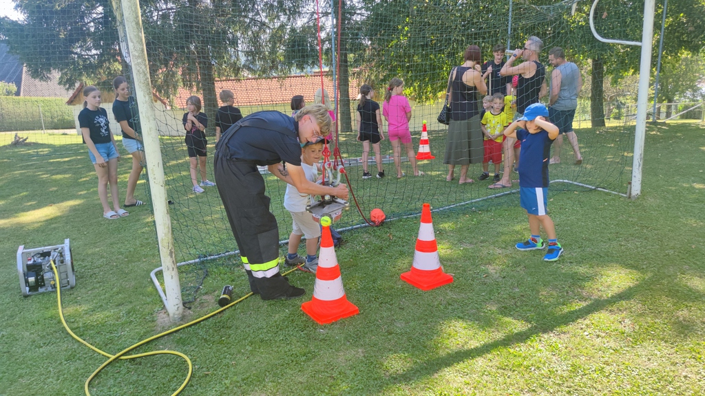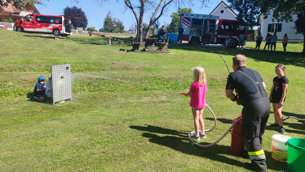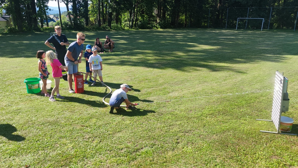 Bei Spiel, Spannung und Action konnten die Besucher die Feuerwehr hautnah erleben: Eine Fahrt mit dem Feuerwehrauto, erste Versuche mit dem Feuerwehrlöscher und verschiedene Geschicklichkeitsspiele sorgten für Begeisterung. Bei sommerlichen Temperaturen war vor allem eines wichtig – Abkühlung für die Kinder, die natürlich nicht zu kurz kam.